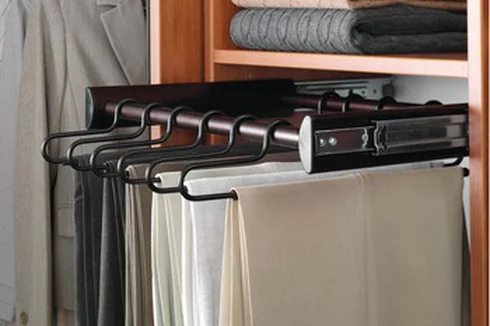This pull-out pants rack is a smart addition to your short-hanging or double-hanging section (HS, HD). The 18 inch rack comes with 12 hangers, the 24 inch rack has 18 hangers, and the 30 inch rack has 24 hangers. The rack has full extension soft-close slides. For hanging skirts, garment clips are available (order as separate accessory).