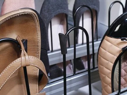 This shoe organizer is the perfect solution to utilize closet depth and allow easy access. The 18 inch unit holds 6 pairs, the 24 inch unit holds 9 pairs, and the 30 inch unit holds 12 pairs. The organizer has full extension soft-close slides. Sandal clips convert the front row into sandal/flip flop storage. Not suitable for high heels. Wide shoes might not fit all prongs in a row.